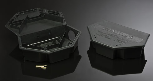 This tamper-resistant bait station locks automatically when closed and unlocks with a special 2-prong key that also opens other Bell bait stations. A one-piece liner makes cleaning and rebaiting easy. Service time is reduced because of its easy accessibility.