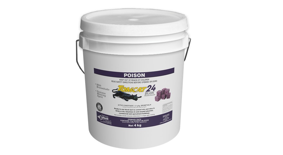 TOMCAT24 BLOX Rodenticide with the active ingredient, bromethalin, is Bell’s acute block formulation. Due to an effective knockdown when compared to anticoagulants, more rodents may be controlled with less bait. Technicians save time and money with TOMCAT24 BLOX Rodenticide. Norway rats, roof rats and house mice usually consume a lethal dose in a single night’s feeding, but it may take two or more days from the time of bait consumption for these rodents to die.